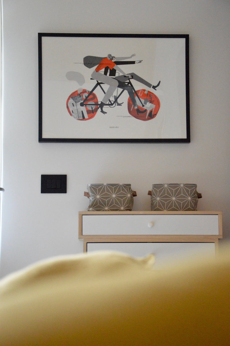 Vi accompagno ora virtualmente nell’ambiente: entrando nella stanza subito sulla destra troviamo una cassettiera color bianco e legno naturale; scegliamo volutamente a contrasto una cornice nera con un soggetto in movimento non allineato al mobile, così da sottolineare ancora di più lo spostamento delle ruote.