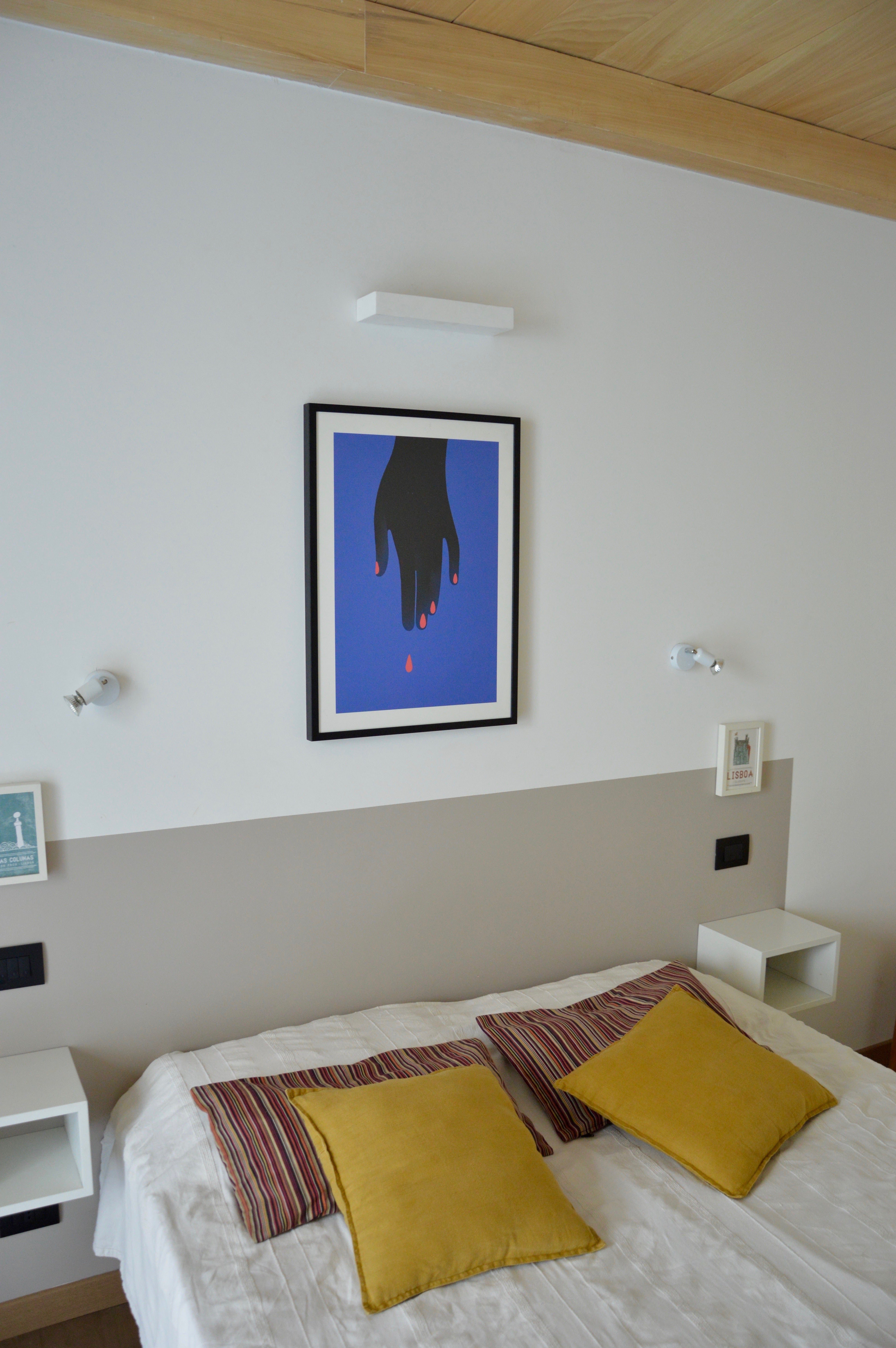 Ho deciso però di concentrarmi su un ambiente specifico, la zona notte, proprio partendo da questo assunto: quan do mi trovo ad avere ampia scelta – di temi/formati/colori – allora la tendenza sembra voler andare per sottrazione. Ovvero si è orientati a scegliere uno, due opere per non rischiare di soffocare l’ambiente.