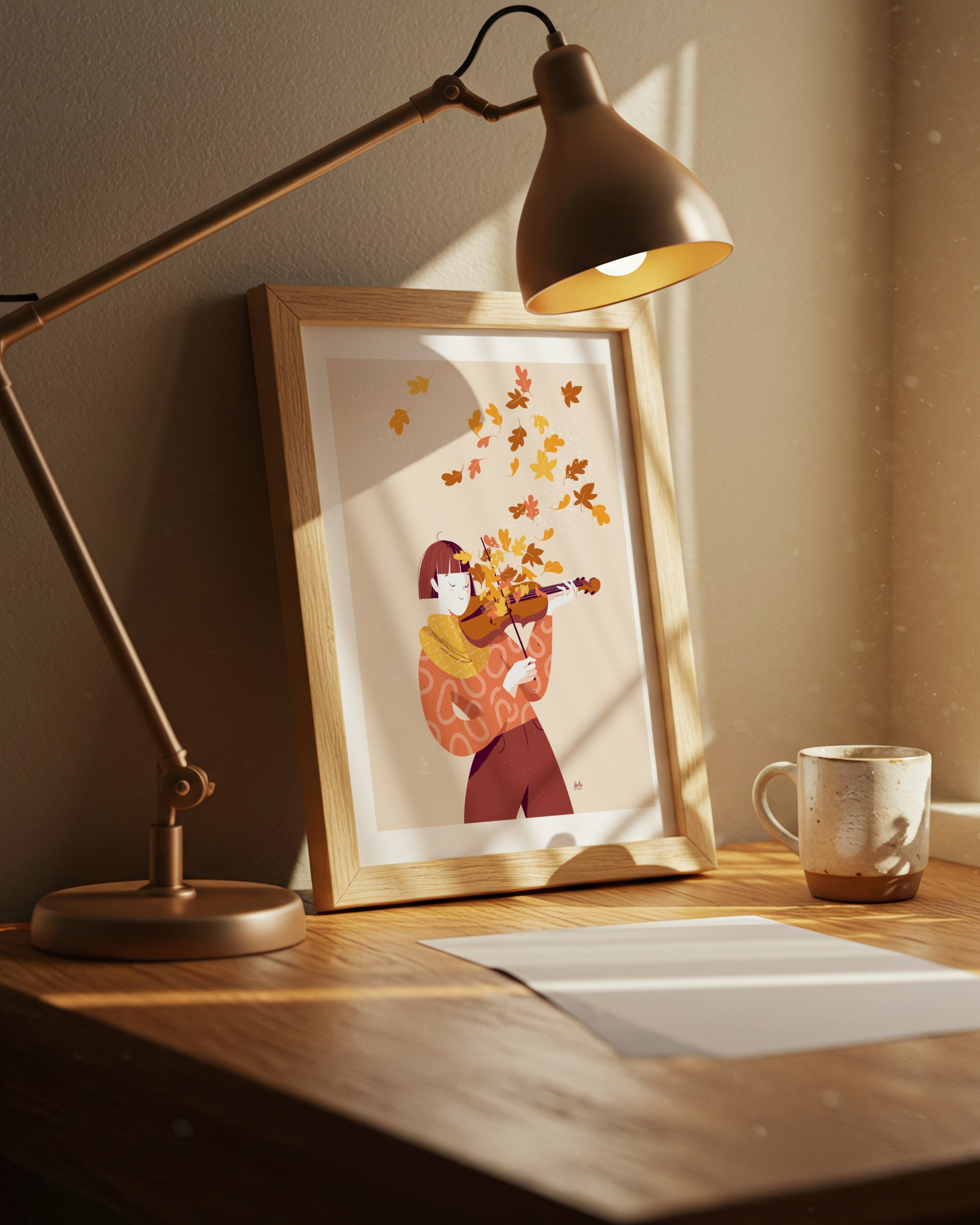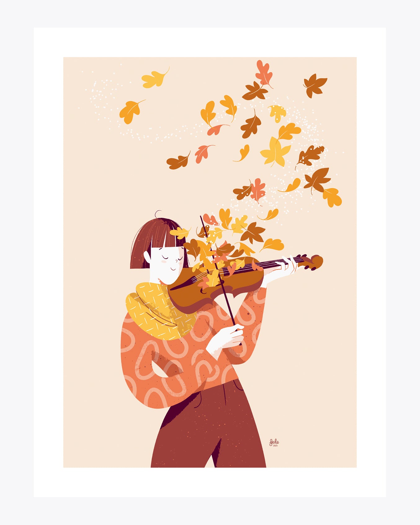 "Foliage" è un'illustrazione di Federica Fabbian stampata in Fine Art. Una ragazza suona il violino: le note emesse dallo strumento sono foglie autunnali che si disperdono nell'aria.